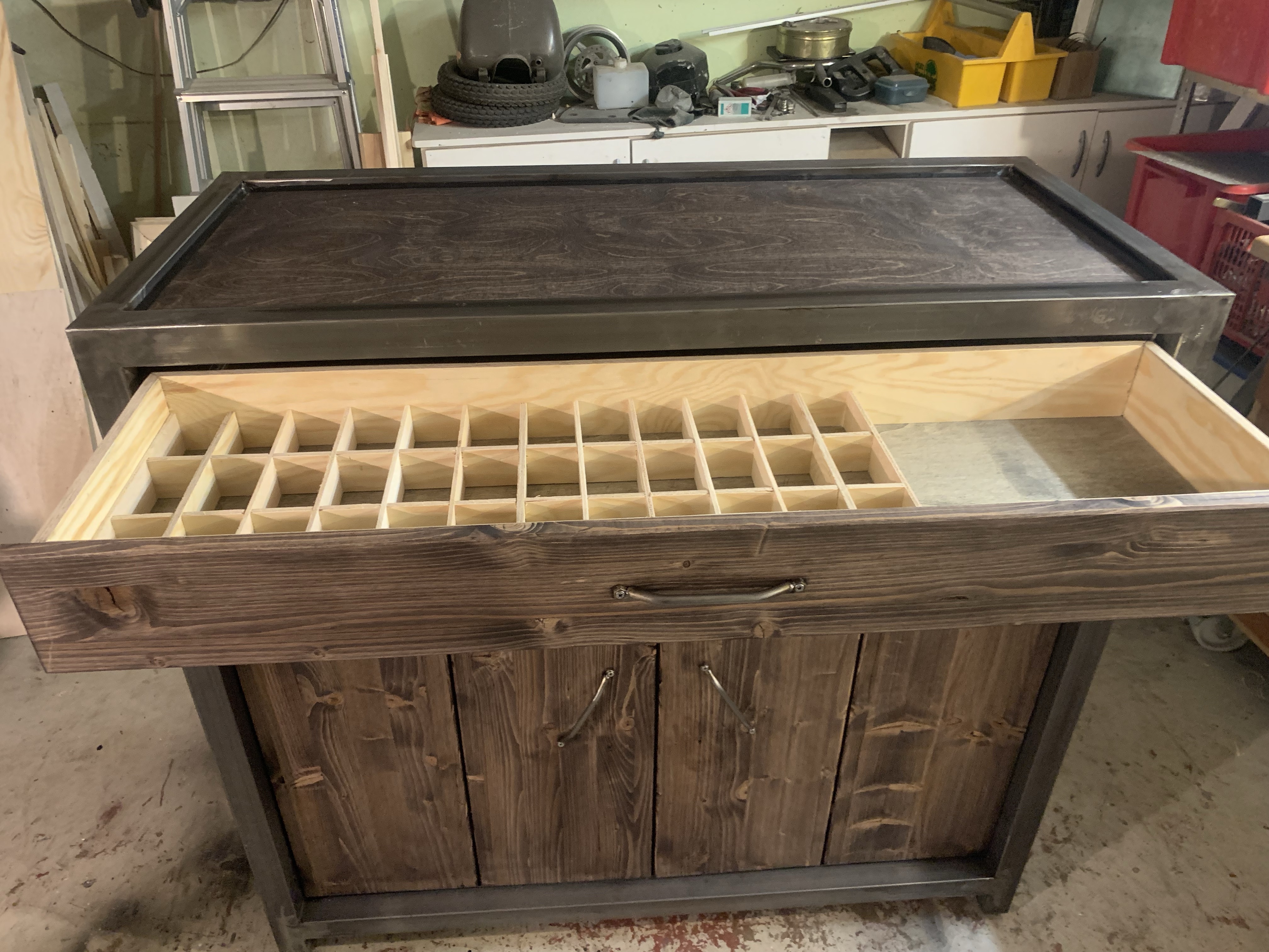 Ein Schrank mit Falttüren und einem Schubkasten über die gesamte Breite.