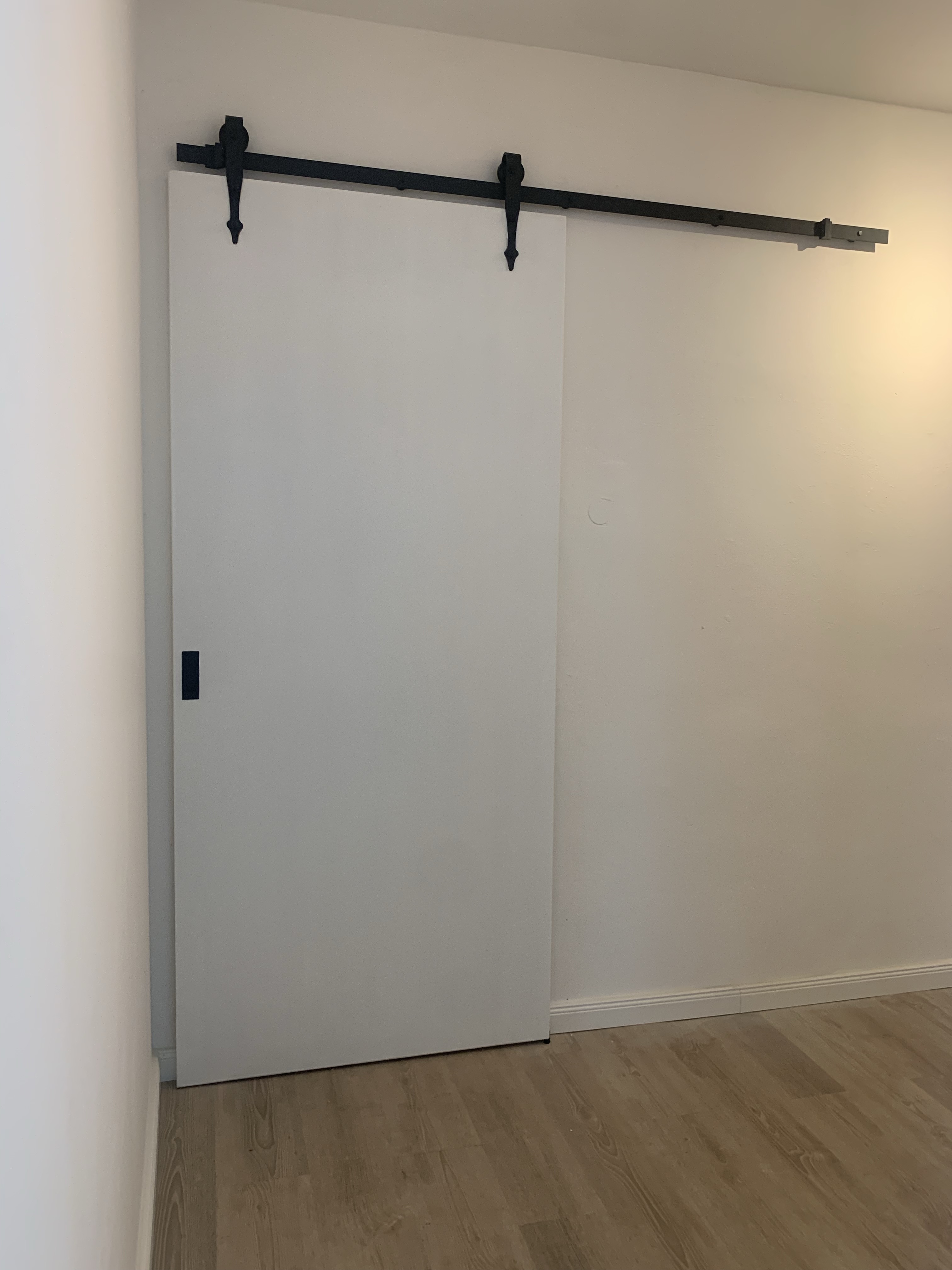 Eine Schiebetür mit einer offenliegenden Eisenführung im rustikalen Stil.